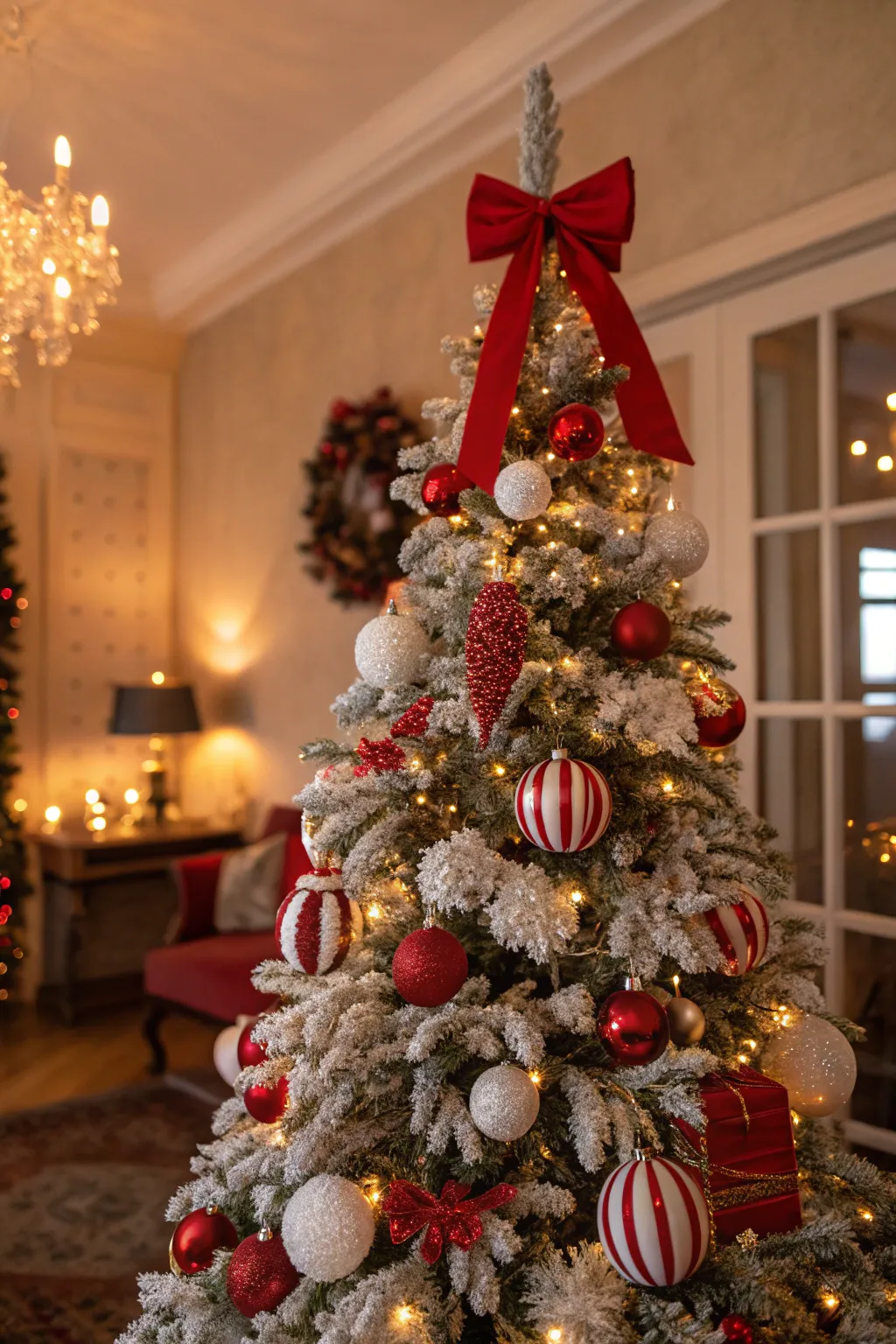 - Scarlet and Ivory String Lights: Radiate your festive spirit via vibrant scarlet and ivory string lights adorning your tree.