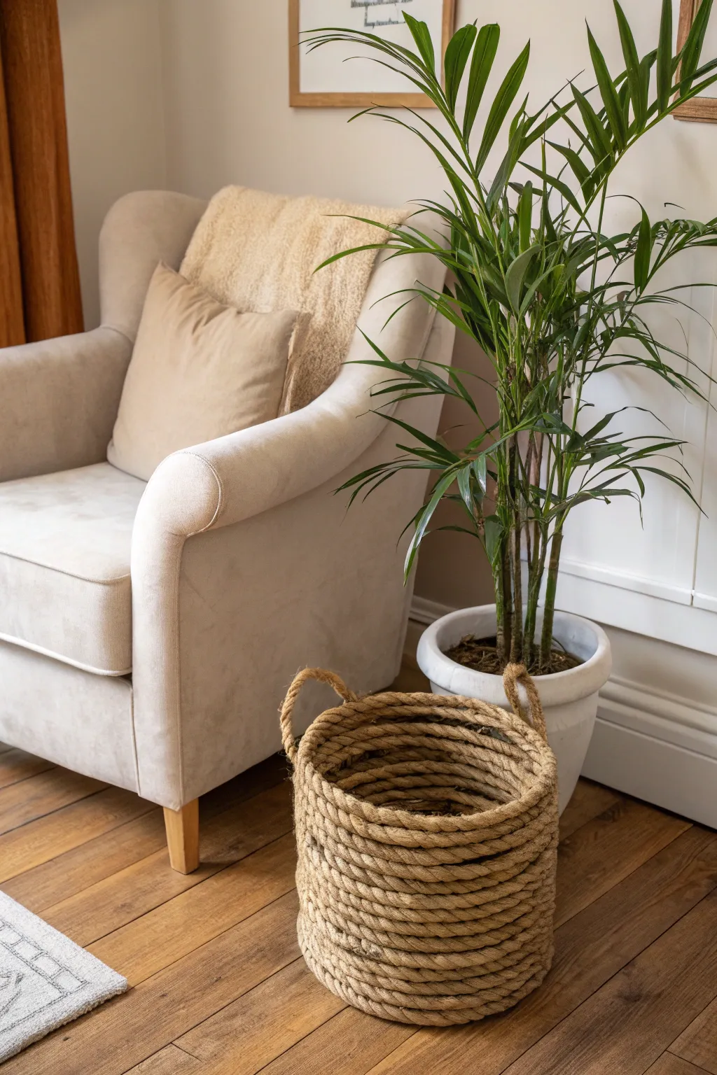 Adopting wicker baskets as sleeves is one of my cherished techniques for a textured and innate aesthetic. It’s suitable for both indoor and outdoor environments.