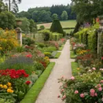 A garden enhanced with a simulated verdant wall seamlessly assimilated with actual flora.