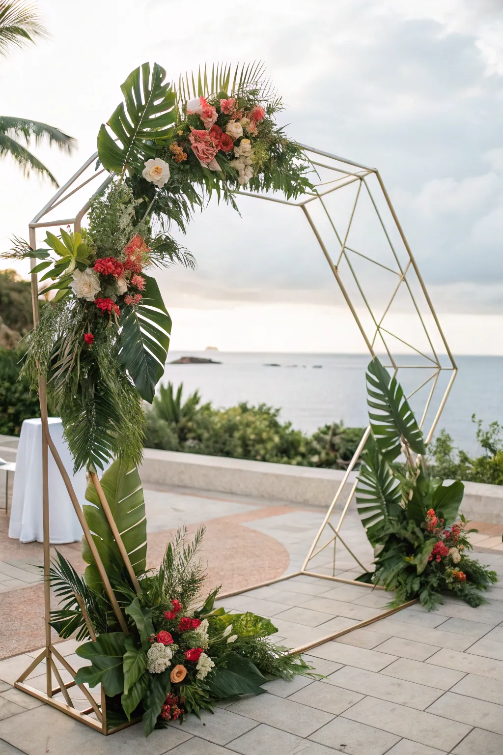 Introduce a contemporary modulation through an isometric arch. I’ve employed metallic and wooden frameworks to fashion striking configurations that stand out exquisitely against a beachfront backdrop.